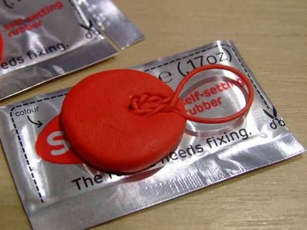 Tomar los dos sobres de 5g Sugru y rodar en dos bolas. Aplanar las bolas para hacer dos discos de 3cm de ancho. Ahora toma el bucle del cable y presione en uno de los discos de Sugru hasta que se encaja la parte torcida pero el lazo que cuelga hacia fuera.