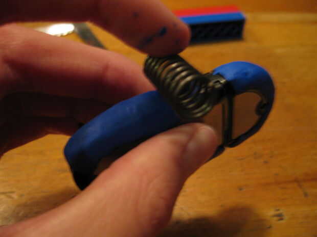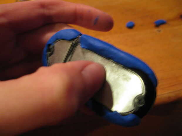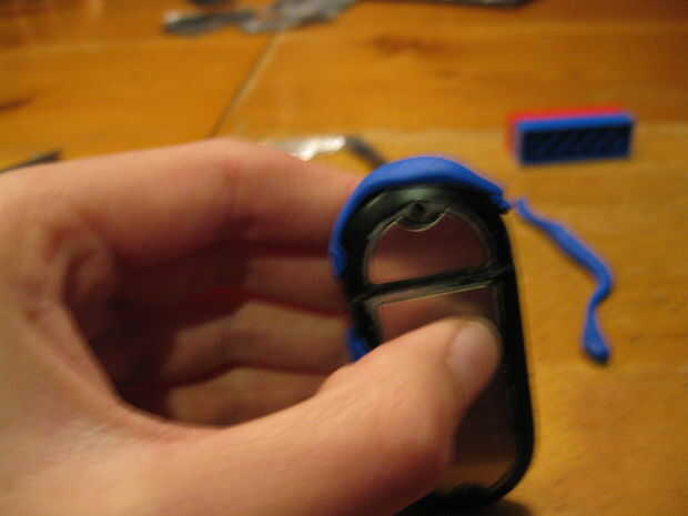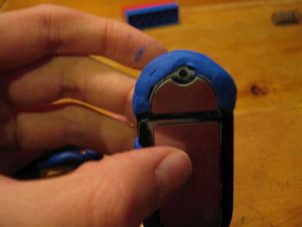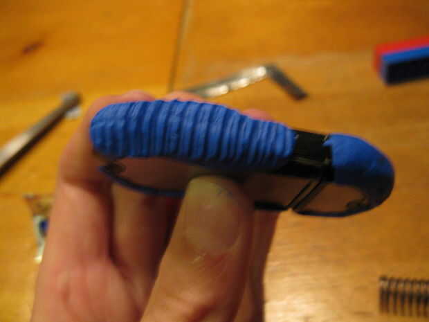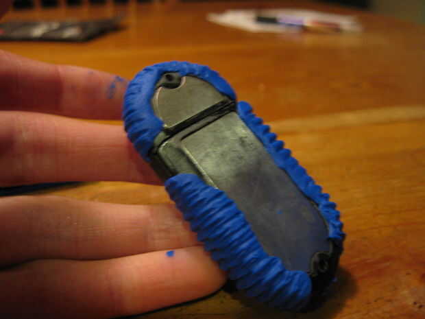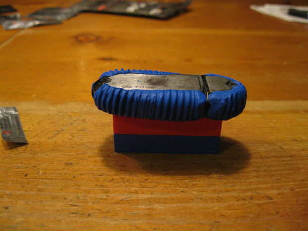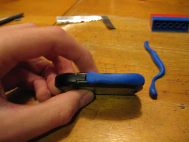 Para la diversión parte: la forma real de la Sugru. La idea básica de este paso es rasgar pedazos de su serpiente y añadir a los bordes del alumbrador. Hay alguna técnica aquí. Un poco de Sugru va un largo camino y también intento sin tocar cualquiera que pones abajo, como mete a los bordes. Trate de mantener los bordes como liso y recto como sea posible, reducirá la cantidad de ajuste que tienes que hacer más tarde. Una vez que ha cubierto tanto el encendedor como usted quiere, es tiempo de pasar a texturizado. Tomar un objeto con un patrón interesante y presione contra el Sugru. Sólo se necesita una ligera presión para impresión, por lo que no empuje a duro. Usaba el borde de un muelle, pero cualquier cosa con textura podría trabajar (metal moleteado, malla de alambre, etc.). Una vez haya terminado, ponga para arriba en algunos legos, asegurándose de que nada toca el Sugru mientras está secando. Les esperan 24 horas, que es el tiempo de curado recomendado.