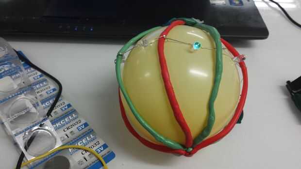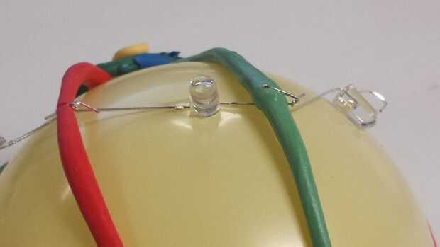 Una vez hecho esto, empecé con un LED y había empujado los cables entre el balón y el sugru. Envolvió el gancho más grande alrededor de la Sugru dedica el pequeño bucle de un segundo LED y había presionado junto con un par de pequeñas pinzas. Seguí alrededor de la bola hasta que tuviera todos los LEDs en su lugar. No conecte los dos cables abiertos.