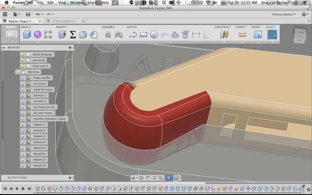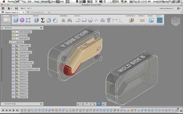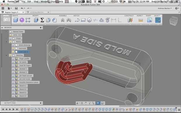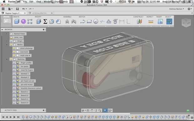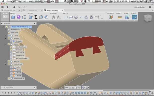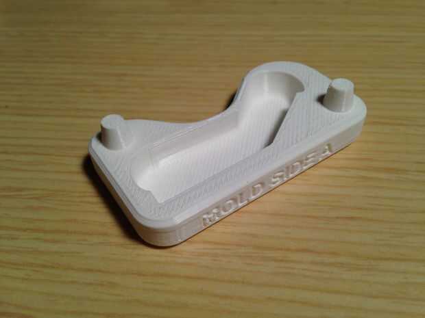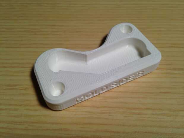 Empezar por modelar la interfaz con el material moldeado. Utilizar funciones de carpintería mecánica (como colas de Milano) para garantizar un vínculo seguro entre el recubrimiento y la base. Después de modelar el Sobremoldeo y la pieza base, restar de un bloque compensado todas las superficies de 0.25mm (excepto el XY plano paralelo las superficies, los lados de la falange) para hacer un buen ajuste con la parte de base y espejo del bloque para hacer un molde de dos partes. Añadir algunos pernos de alineación afilado (compensar los negativos por 0.25 m m) para asegurarse de que el molde se coloca correctamente.