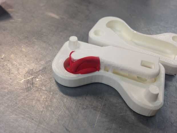 Colocar la pieza en el molde y aplicar más Sugru y presión según sea necesario para llenar el lado de la cavidad del molde. Luego aplica un poco de exceso de material a la parte que sobresale y alinee y presione hacia abajo con el lado b del molde. Presione firmemente con las manos o con una abrazadera de C. Usted puede cuidadosamente retire la parte después de este paso o dejarlo curar durante 24 horas en el molde y sacarlo al día siguiente.