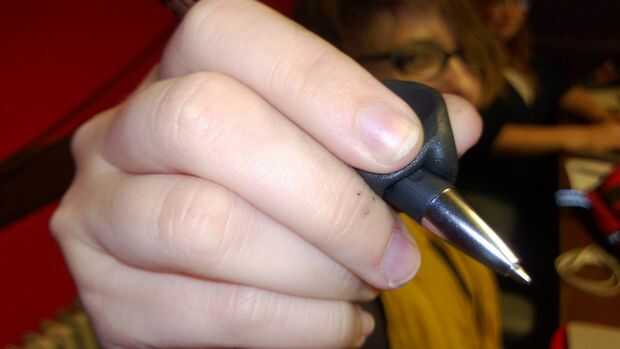 Sujete el lápiz con el sugru como se ve en la primera foto hasta que se instala en una forma cómoda con la que escribir.