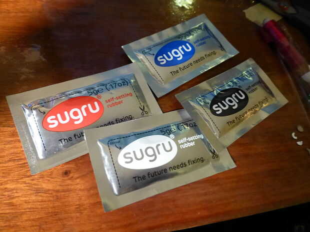 Sugru es un caucho de la uno mismo-ajuste para fijar, modificar y mejorar cosas.  Se moldea como plastilina, adhiere a casi cualquier cosa y se convierte en un caucho de silicón flexible, fuerte durante la noche.  Viene en varios colores y es ideal p