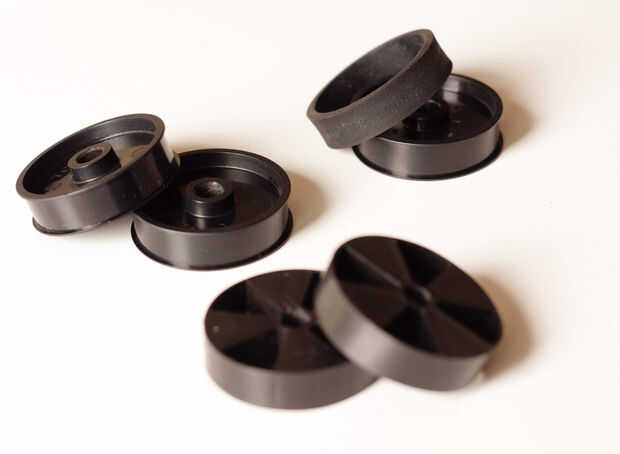 Las ruedas de plástico pequeño que ves en la foto vienen de un par de impresoras. Si tienes suerte encontrarás ruedas ya con una buena banda de goma antideslizante, pero en algunos casos les falta. De todos modos usted puede construir fácilmente por sí mismo un buen neumático para hacer que las ruedas funcionen mejor en sus robots. Para hacer que usted necesitará un pequeño paquete de
