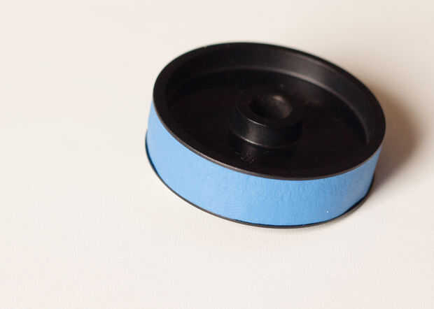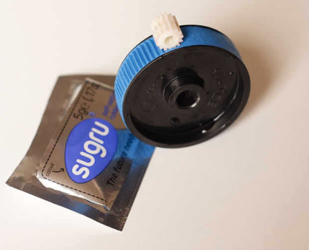 Ahora tenemos que encontrar una manera de hacer el sugru salir para llegar a la tierra, porque en este estado las protuberancias hará que el deslizamiento de la rueda. Es necesario algo similar a la rueda dentada pequeña que ves en la foto. Tal vez usted encontrará algo igualmente eficaz. Hacer la corona rodarla sobre el sugru y en el mismo empuje de tiempo para que vaya a grabar gran cantidad de ranuras en el material blando. De esta manera el Sugru debe levantarse y ocupan un mayor volumen, que sobresale sobre las fronteras.