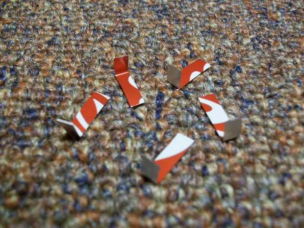 Antes de los dientes pueden ser Unidos al tiburón Sugru, necesitamos hacer algunas pequeñas escuadras metálicas para sostener en. Para hacer esto, simplemente cortar tiras finas de las tiras de metal que se corta antes. Doblar cada una de estas pequeñas piezas por la mitad para formar una escuadra de 90 grados. Usted necesita en arrendará cuatro de estas escuadras pequeñas. Asegúrese de que un extremo del soporte es lo suficientemente corto como para esconderse detrás de los dientes.