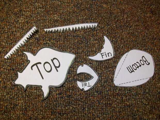 El patrón se usan para cortar las piezas para usted Sugru tiburón es publicado a continuación como un documento de Microsoft Word.  Simplemente imprima esta página y cortar todas las formas con la herramienta de corte que está más cómodo (no sin embargo en espadas o hachas).  Si es posible, imprimir la plantilla en cartulina (u otro papel grueso), Esto facilitará paso 4.