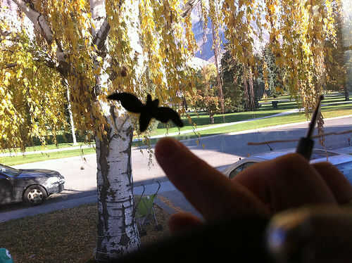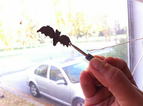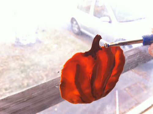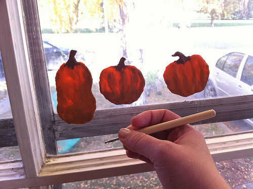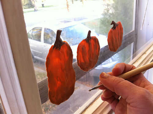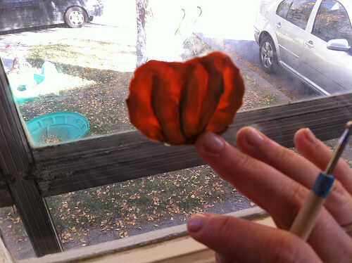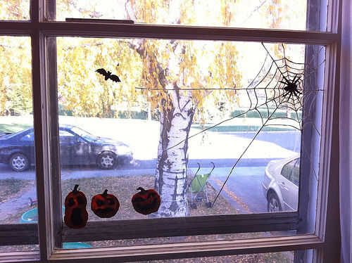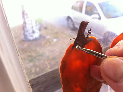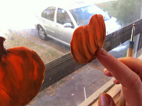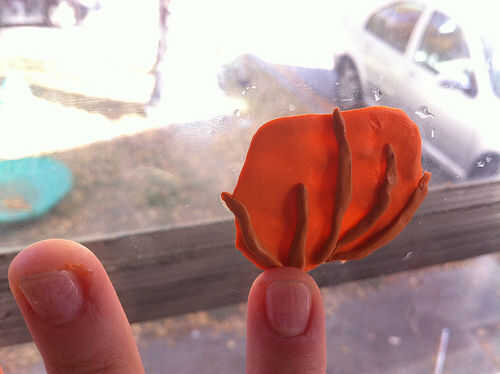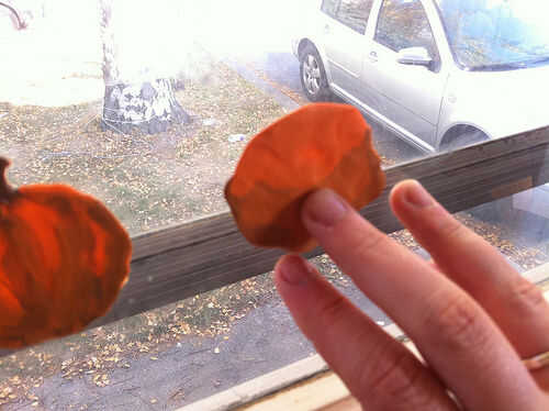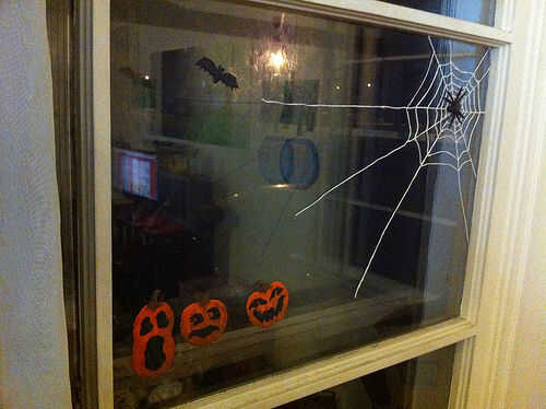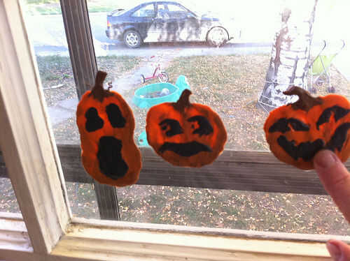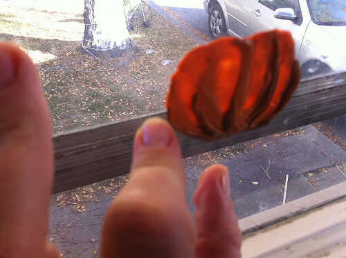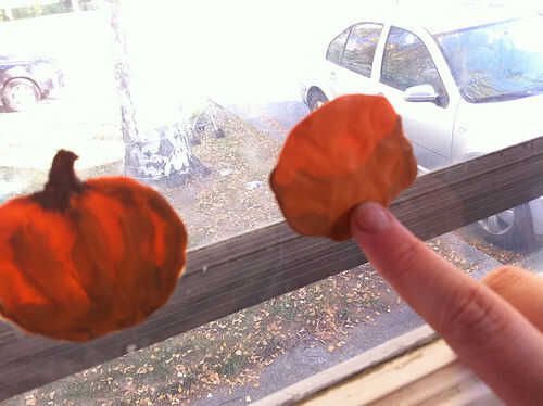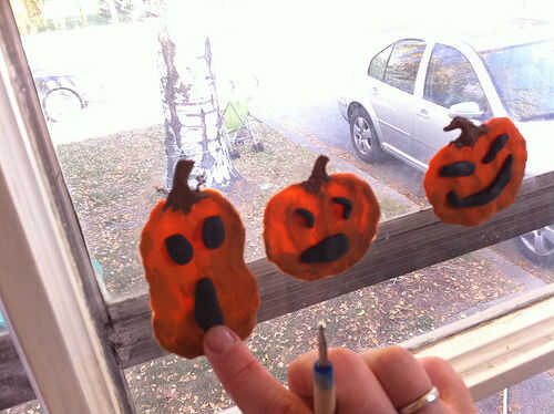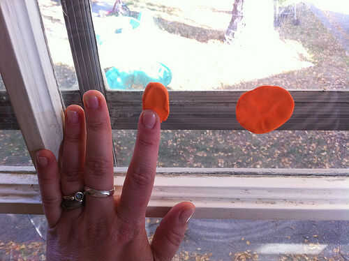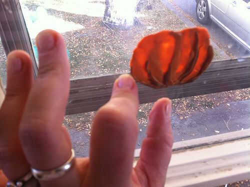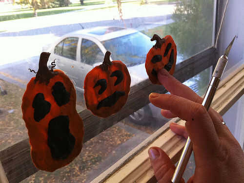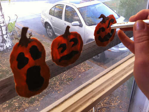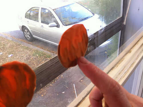 Hice algunas calabazas para nuestra ventana después de hacer una tela de araña. Presiona el Sugru en la ventana, luego había manchada suavemente la naranja Sugru hacia adelante y hacia atrás hasta que las líneas de las calabazas me habían adecuado. Luego agregó características realmente ásperas con Sugru negro y había refinado la forma con una herramienta de arcilla.