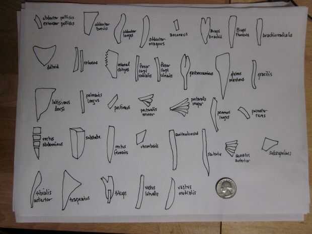Sugru cura relativamente rápidamente. Tiempo de trabajo puede ser a lo más dos horas. 30 minutos es el tiempo recomendado, pero he encontrado que podría ser trabajado ya. Así, por esta razón, puede ayudar a preparar los músculos individuales por adelantado. La guía del dibujo a continuación da una aproximación de la cantidad de sugru necesario para cada músculo. Asumir que las piezas son muy planas - 1mm de espesor o así.