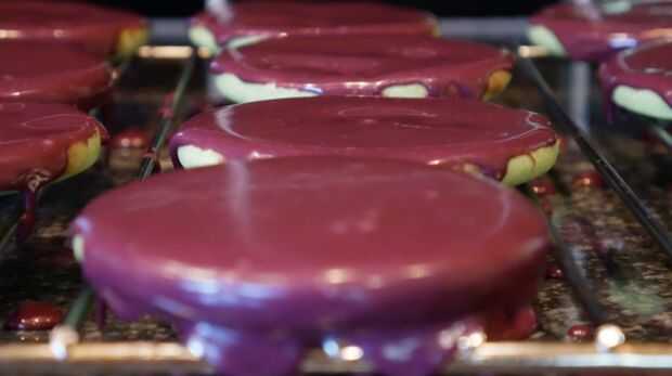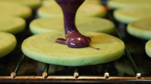 Templar el chocolate blanco y mezcle con el colorante de alimentos. Así que la parte trasera está mostrando y rocía el chocolate sobre y deja dar la vuelta las galletas.