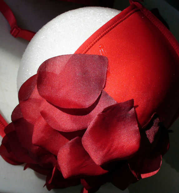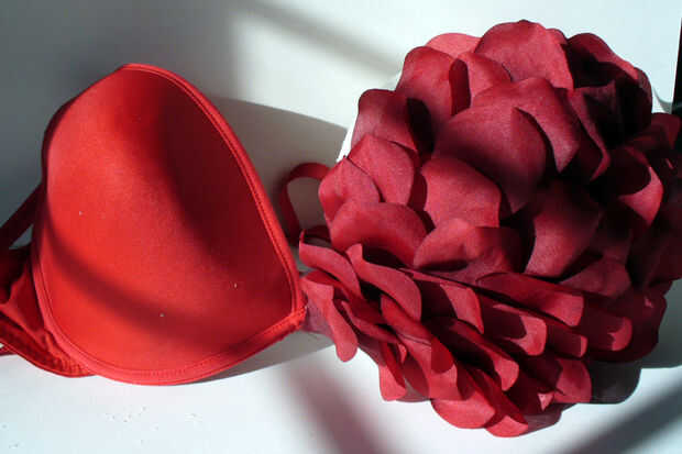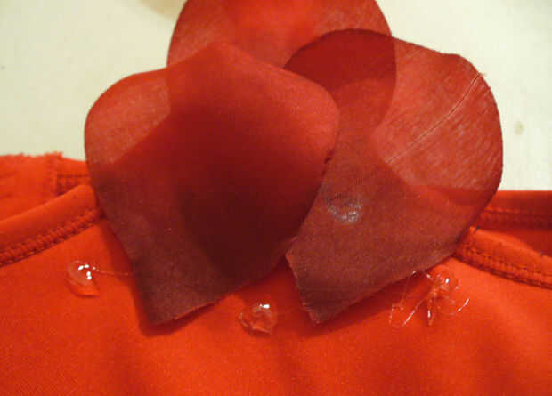 Empezar a pegar! Vas a estar haciendo un lado a la vez, pues elegir un lado y arreglarlo para que pueda ver bien. A partir de la parte superior, donde el sujetador con la correa, aplicar un poco de pegamento y su primer pétalo. Trabajar su manera abajo asegurándose de dispersión de los puntos de pegamento para crear ese look de sirena escala ish. Dependiendo del tipo de pegamento que utilizas, puede tener cierto margen de maniobra para tiempo seco, y usted puede colocar unas gotas de pegamento a la vez. Obviamente con una pistola de pegamento caliente usted cant.
