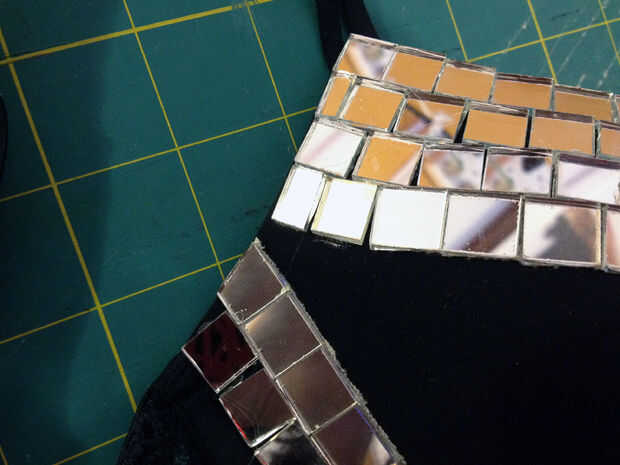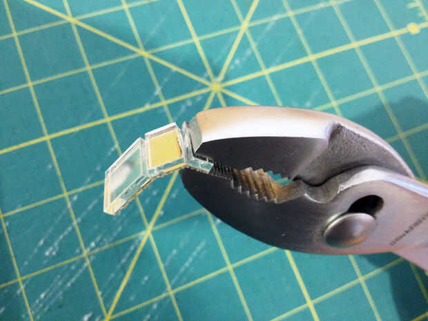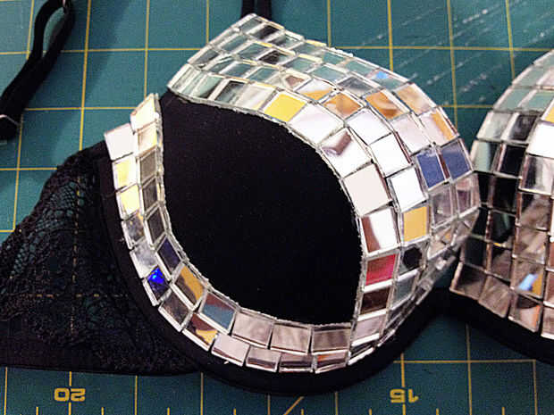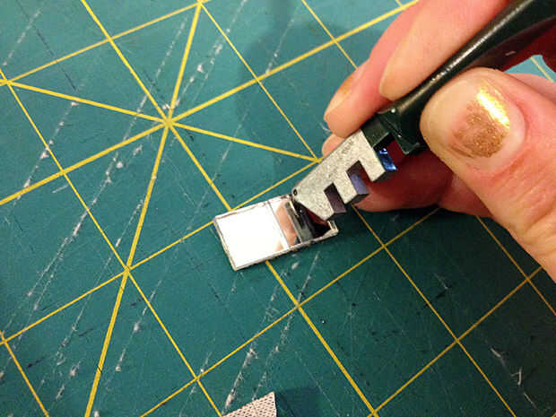 En este punto me encontré una fila más a lo largo de la parte inferior, hasta que las filas en el lado (la primera imagen es en la foto de una fila de tímido). Ahora para la primera ronda de corte. Antes de rellenar el resto de la parte inferior la mitad del sujetador, uniformar las fichas en el lado cortando y rompiendo como se muestra. Esto puede tomar un poco de práctica, pero es bastante fácil una vez que el cuelgue de ella. Corte un borde limpio es clave para tener su sujetador acabado gran.