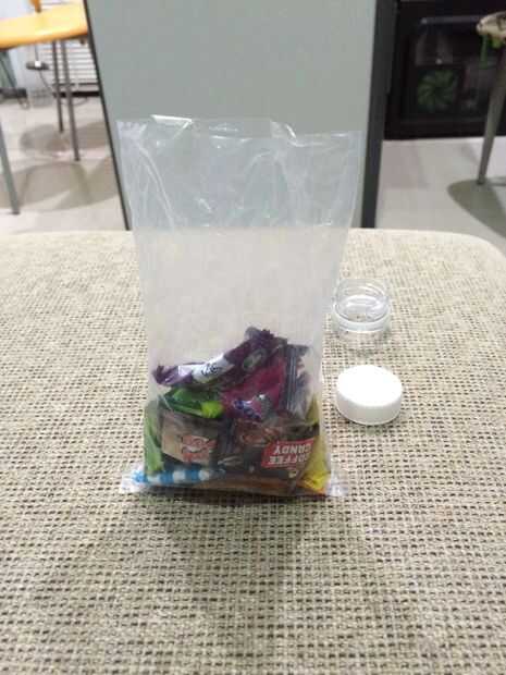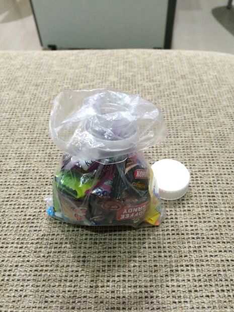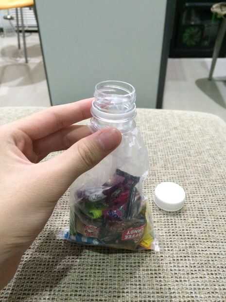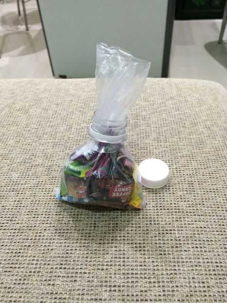 Ahora tome el plástico de galletas o dulces. Hacer es un poco como en la primera foto. Ahora, desconecte la tapa de la botella. Poner el plástico por la parte del cuello de la botella, como en la foto 2 y 3. Ahora, doble el resto del plástico fuera de la parte del cuello de la botella como en el cuadro 4. Y así está listo para la parte de acabado.