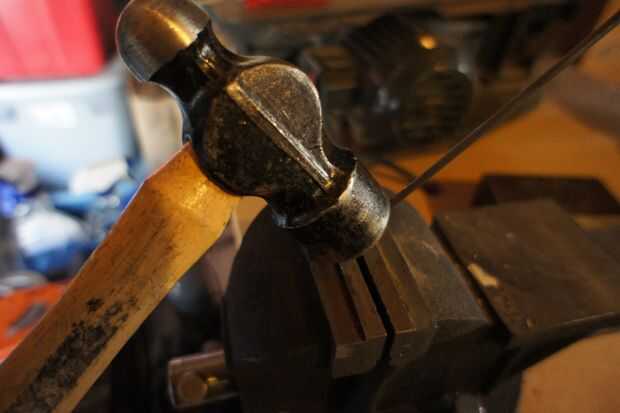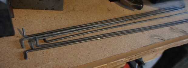 Unos golpes con un martillo en cualquier superficie plana de metal, como un vicio, mientras rueda la voluntad de alambre lo enderezan. Aproximadamente una pulgada de uno de los extremos de cada cable en el tornillo de la abrazadera y poner una curva de noventa grados en él. Luego cortar los cables para ajustar el gabinete. Un poco de ensayo y ajuste conseguirán un buen ajuste.