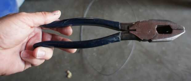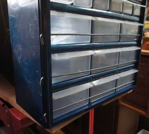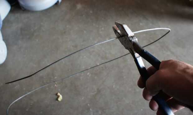 Alicates del juez de línea son la herramienta adecuada para esta parte. Cortar un trozo de alambre de esgrima para cada fila de cajones, dejando el hilo un par de pulgadas más largos que la anchura del gabinete.