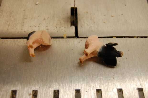 Línea de la figura y poner en marcha la sierra. Toma una respiración profunda, disculparse profusamente y alimentar directamente a través de. El plástico es blando y cortes sin mucho problema, pero cortar rápidamente - el plástico se derrita lo contrario.