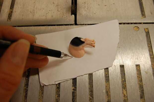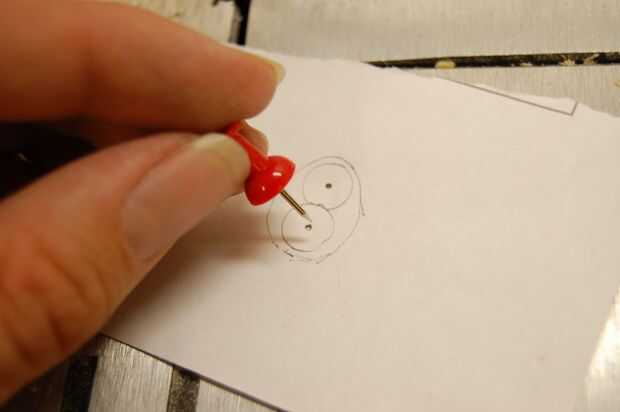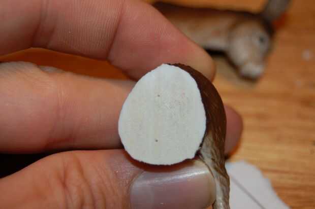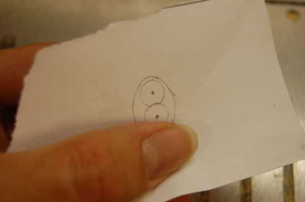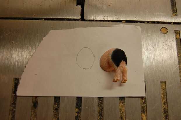 Si la estatuilla fue cortada en un ángulo, tendrás que compensar un poco el contorno. Alinee la segunda mitad de la figura y el contorno como con un corte perpendicular. El desplazamiento será aproximadamente de 1mm de un corte de 45 grados y una fracción de un milímetro entre 45 y 90 (perpendicular). El ángulo del corte depende de la dirección (ya sea cambiar el contorno izquierdo o derecho). Si el corte va de la pata derecha delantera del animal a su pata izquierda trasera, entonces el esquema se desplazarán a la izquierda. Si se corta de la parte delantera izquierda a la parte posterior derecha, entonces el esquema debe ser cambiado de puesto derecho. ¿Entiendo? Buena. Haga dos agujeros con el pasador.
