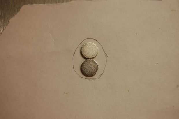 Tome una mitad de cada animal y trazar su contorno en una hoja de papel. Nota Qué animal es el contorno, y que la mitad del contorno fue tomado de. Ahora, marcar los centros de los imanes en el contorno, mantenerse alejado de los bordes si es posible. Utilicé mis pinzas para esto - simplemente mide el diámetro del imán, había añadido un milímetro o dos, luego penetra los agujeros en el contorno usando los puntos de la pinza. Pero, a mano alzada está bien también. Una vez que los centros están marcados, poke agujeros a través del papel en estos puntos.
