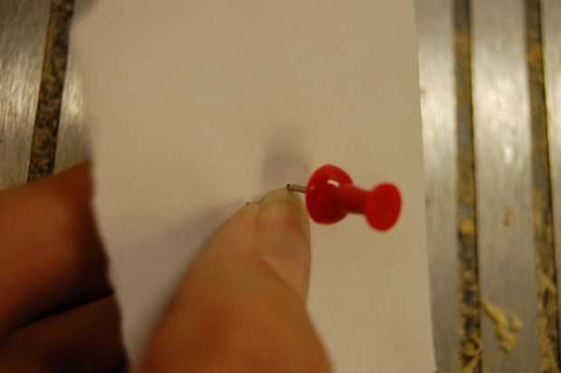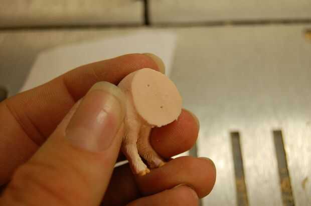 OK, la estatuilla fue cortada en un perpendicular del ángulo (90 grados) a su "columna vertebral". En este caso, mantenga la figurita contra la vuelta del contorno y use una luz para alinear los dos. Otra vez, trate de ser lo más preciso posible. Empujar el pasador a través de los orificios como antes.