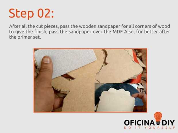 Después de todas las piezas cortadas, pasar la lija de madera para todos los rincones de la madera para darle el acabado, pasar la lija sobre el MDF también, para mejor después del primer.