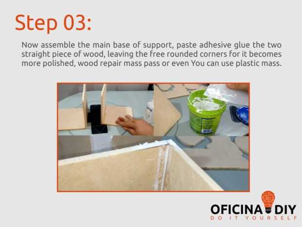 Ahora armar la base principal de apoyo, pegar las dos pieza recta de madera, dejando las esquinas redondeadas gratis para él más se pule, el pegamento adhesivo madera reparación paso masivo o incluso puede utilizar masa plástica.