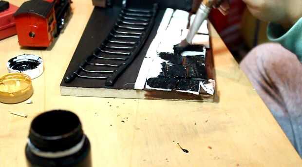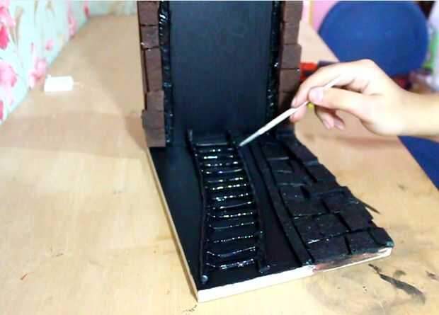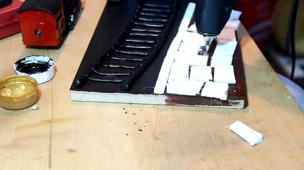 Com mais alguns quadrados de isopor, preencha toda una plataforma de da região, onde será o piso. Grude com cola quente e pinte os quadrados com una tinta preta. (figura 1 - 2)