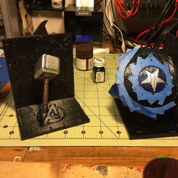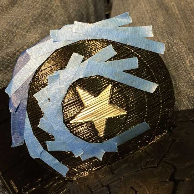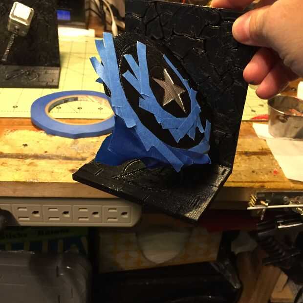 Martillo de Thor de la pintura era bastante fácil. Sólo pintar los pedazos individuales con mucho cuidado. Escudo de pintura Capitán América es mucho más difícil. Determina la mejor manera de pintar era empezar desde el centro y pintura exterior. Primero pinté la estrella en el centro. Utiliza cinta de pintor azul para separar las secciones de color. Dolía hacia fuera, azul, rojo, plata y rojo otra vez.