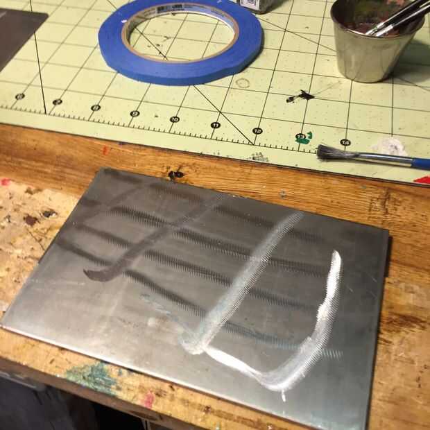 Luego mide y corta 1/16" las placas de metal para sujetar a los delimitadores. Tenía que anotar las placas un poco en orden para el pegamento unir. Usé pegamento Gorilla para unir los dos.