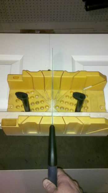 Usando una caja de ingletes (o una sierra para cortar ingletes de potencia si tienes uno). Cortar el apoyo. Pecar de demasiado cuando su corte.