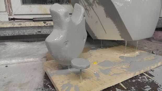 Sistemáticamente pieza por pieza sobre líquido espuma de poliestireno se cortó y poco a poco consiguió una forma.
