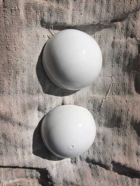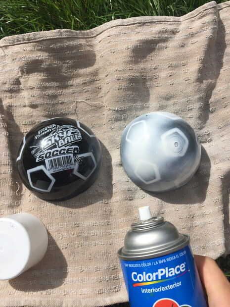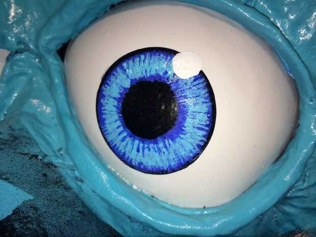 18. para los ojos compré una bola super animosa de walmart y cortar por la mitad. Su blandita para que encaje en el zócalo del ojo muy bien. Pintura la a mitades con Gesso. una vez seco les spray pintura blanca brillante. una vez seco, usé una vieja tapa de la botella (aproximadamente del tamaño de medio dólar) para dibujar en los círculos del iris con un rotulador.