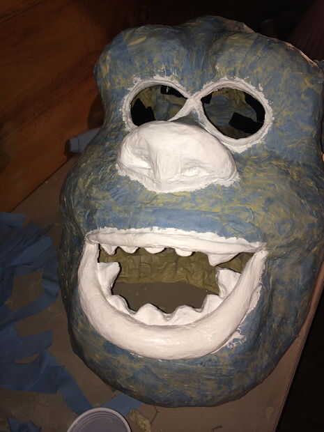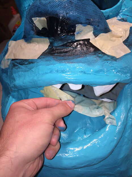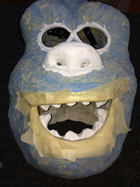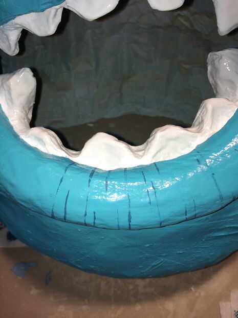 16. cubrir los labios y la nariz con cinta de enmascarar (una vez que estén secos) y pintura de aerosol los dientes blanco brillante. La cinta con bloquear la pintura blanca y no quitar ninguna pintura una vez que te quitas la cinta.