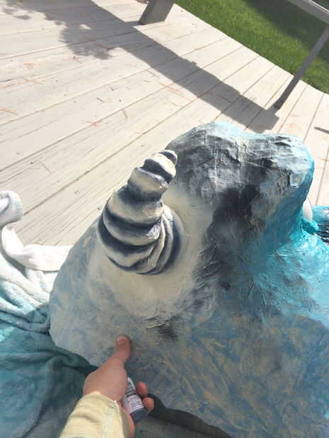17. pinte los cuernos. Utilicé una pistola de pintura con aerógrafo por primera vez este año y había probado en los cuernos. Usé un acrílico líquido gris plata y rocía la capa base con un color marfil. Pintar la punta blanca. Una vez que se secaba Rocíe los detalles oscuros hasta los cuernos.
