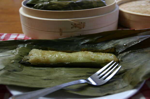 Tiene maravillosa textura masticable, pegajosa, pegajosa que viene de tratar el arroz en lihiya, o agua de lejía.