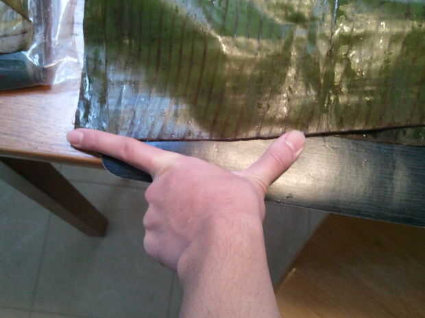 Con el pulgar extendido y dedo índice (de 16 a 18 cm o 6 1/3 a 7 pulgadas), mida las hojas en anchos aproximadamente iguales y corte en la misma dirección que las venas.