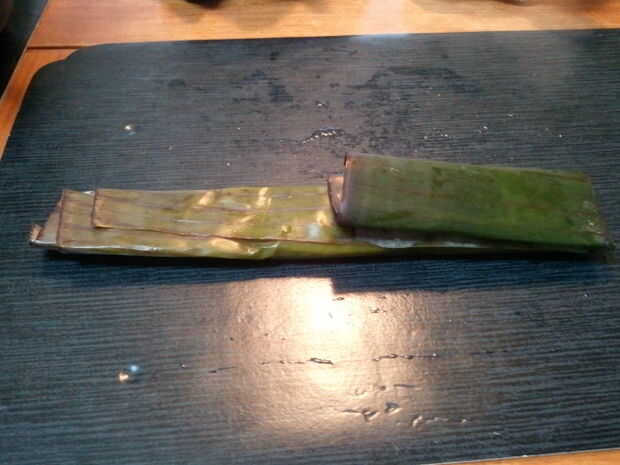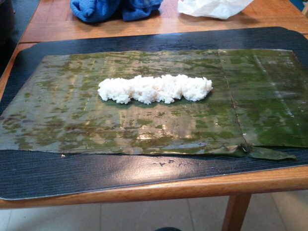Limpie la hoja de plátano y cucharada 1/4 taza de arroz parcialmente cocido sobre ella.