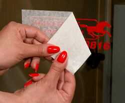 3. Coloque la etiqueta en la ubicación deseada y aplique presión uniformemente a través de la etiqueta engomada de aproximadamente un minuto mientras que empuja a las burbujas.