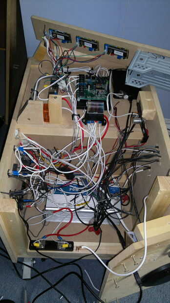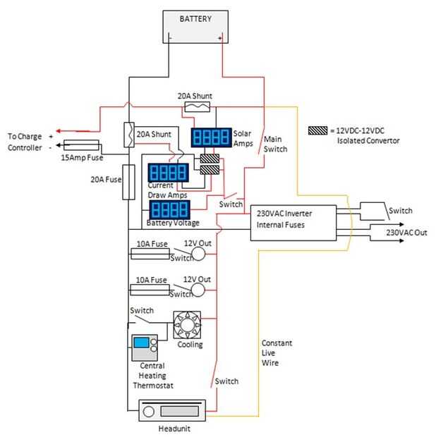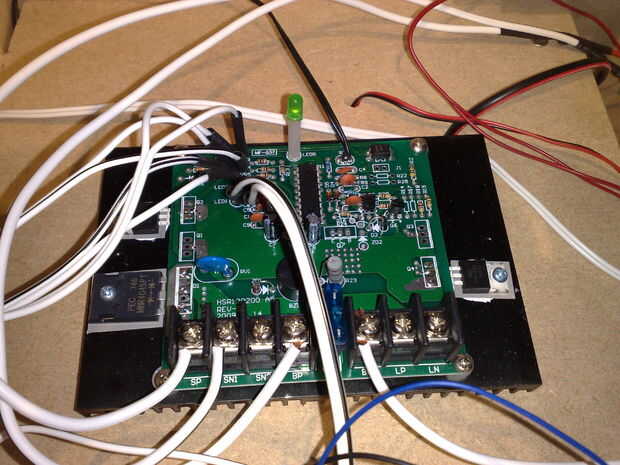 La parte más fácil, bueno, para mí de todos modos, fue cableado todo juntos. La mayoría de los dispositivos está conectada mediante barras de distribución. Los amperímetros de panel digital no se puede ejecutar el mismo circuito que está midiendo, por lo tanto los dos convertidores DC-DC son vitales para el proyecto. Tomar 11 a 15 voltios de la batería y convertirlo en una fuente aislada y regulada de 12 voltios. Por esta razón el shunt es antes el fusible principal en el circuito, puedo medir la corriente que va en la batería y no hay peligro de un cortocircuito antes el fusible porque el amperímetro en cuestión está totalmente aislado de la red. El voltímetro digital sin embargo puede ser alimentado de la fuente que está midiendo. Realmente no puedo explicar cómo mina está conectado porque cada caso será diferente dependiendo de sus necesidades aunque el diagrama del circuito para mi proyecto en particular se muestra aquí. ¿Como tuyo para arriba cuidadosamente y correctamente y asegurarse crimpings todas son seguras, los conectores están conectados y que todos los cables expuestos están suficientemente cubiertos usando cinta aisladora o tubo termo retráctil, no queremos grandes chispas y fuego en nuestras manos, hacemos? El controlador de carga que usé es un pantano estándar a granel carga, regulador de la carga-off, nada extravagante. El regulador tiene 4 luces de LED que dictan cómo carga la batería es, estado 25, 50, 75 y 100 por ciento de la carga, abrió el controlador y corte el LED de en sus cabezas, había añadido los cables a las patas, cubiertas las piernas expuestas con tubo termo retráctil, entonces compró algunos LED actual baja Maplins y dispuestas en el panel frontal. Mi generador particular tiene una gran cantidad de cableado, como muestra la imagen.