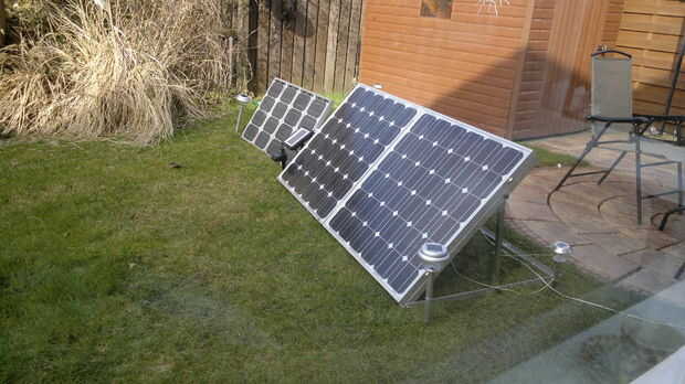 Mi primera matriz original de 48 vatios utiliza un soporte de madera que dobla hacia fuera para apuntalar los paneles, sin embargo, la madera no es un buen material para este trabajo, constantemente se moja y la mina finalmente descompuesto a través después de un invierno, no quiero que la probabilidad de que ocurra de nuevo en mi matriz caro 160 vatios por lo tanto, que decidí que necesitaba una montura metálica de algún tipo. Viendo las maravillas de la Interweb, encontré que Ebay (sí sé! ;)) había algunos pre fabricado unos, hecha de aluminio y disponible en diferentes tamaños pero costo alrededor de la marca de £50. Pensé "Pah! Voy a hacer algunas de mis propias", obtener longitudes de barra de aluminio L lugar de trabajo de mi papá gratuitamente y encontrar algunas tuercas y pernos repuestos de garaje como la bisagra. Quería que mis paneles a ser ajustable según la época del año era por lo perforé varios agujeros a lo largo de las piernas favorables así que el ángulo pueden ser alterados, utilizando algunos tornillos de mariposa (el tipo que encontrará en la parte posterior de sillas de oficina, pero más pequeño), los tornillos se pueden quitar rápidamente para cambiar el ángulo, exactamente igual que los ofrecidos en Ebay por £50:).