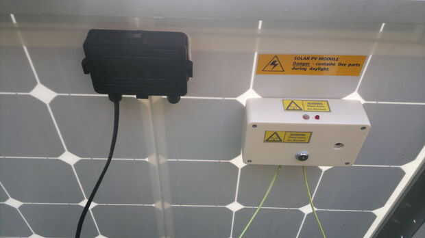 Mi particular circuito utiliza dos estacas que empujan en el suelo, con un cable conectado a cada uno. Si el cable se rompe, o si una de las estacas se quitan de la tierra se activa la alarma de 100 dB, lo que significa que los paneles se pueden mover alrededor de aproximadamente 1 metro cuadrado, pero no más para que los criminales no pueden robar los paneles. Mi alarma es alimentado usando 6AA pilas 9 voltios, mientras que sólo consume 0,08 miliamperios en espera espera de ser activados, esto significa que la batería tendrá una duración de casi 2 años.