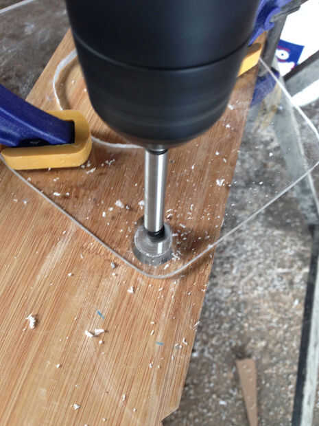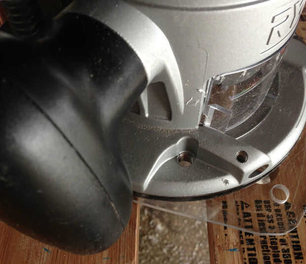 El último paso es averiguar cómo desea adjuntar su base de descenso vertical en la parte inferior de su router fijo. Routers más modernos cuentan con varias formas de colocación de su enrutador para una mesa de fresadora y la forma más común es utilizando algunos tornillos con los orificios prerroscados en la parte inferior de la base de la fresadora. Encontrar el tamaño del perno correspondiente para su router, medir la ubicación de estos orificios en la placa superior y taladrar los agujeros correspondientes. Asegúrese de probar conectar la placa superior a la base de la fresadora antes de ir al siguiente paso.