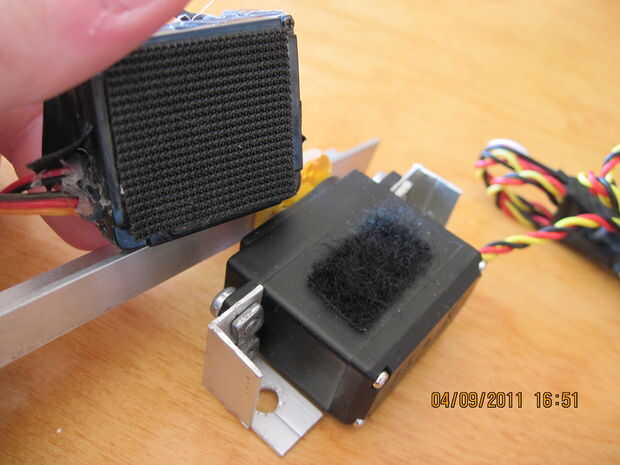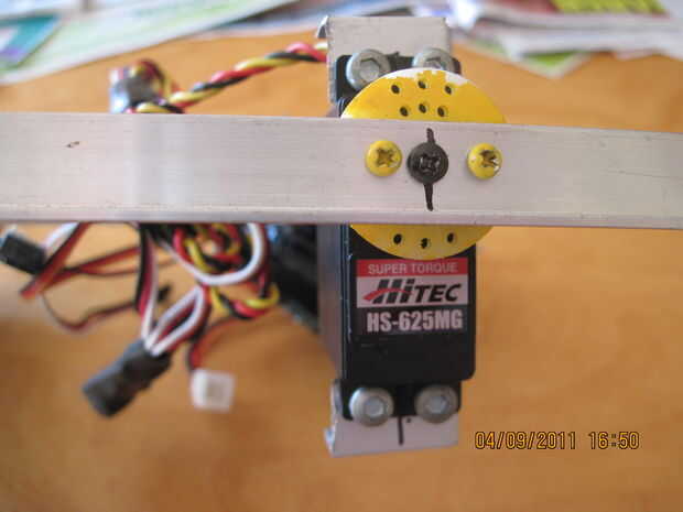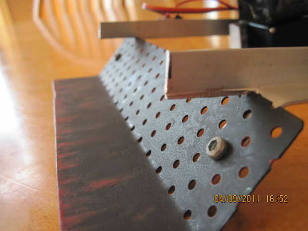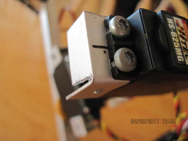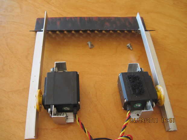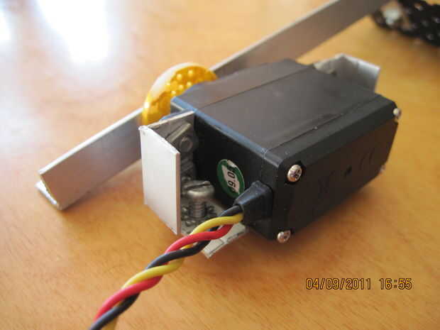 Nuestro robot es ha un bonito poder completo-tren de la impulsión con el 4 X 100-1 metal motorreductores. pero no es tan potente como el robot mucho más grande que 4 libras de peso. así que tenemos que defender nuestros selfs. las reglas no dicen armas por lo que no podemos dañar los otros robots. así que para proteger el robot tenemos un arado. no un arma y es lo que tiene cada otro robot. la única diferencia será que nuestro accionar y puede levantar con otros robots. Esto ha demostrado para ser muy exitoso. Cómo mi robot consiguió primero el lugar y los otros no. el arado se diseñarán para levantar los otros robots tan sus ruedas o modo de transporte es inútil y no puede conseguir tracción en la estera. luego empujamos su robot de la estera. la pala tiene que levantar mucho peso y no se puede doblar o pesan mucho. para mover mi arado tengo dos metal de alto esfuerzo de torsión orientada servos que son opuestos uno del otro. el arado debe brazos que unen la pala y los servos juntos. Dado que los servos están frente a frente uno del otro tenemos un doblador de señal al doble de los servos de señal los dos. la última foto es el doblador de señal. tiene una entrada y dos de salida. una salida es duplicada y alimentada ambos servos. ahora todo dependerá de los servos que se Obtén, para construir los soportes del servo, pero manera lo hice era tomé.5 X.5 de ángulo recto de aluminio y lo doblado y corte hecho abrazaderas perfectos. puede verlos en las fotos. el arado que hice estaba hecho de algún metal que saqué de una vieja caja de la computadora. tiene todos los agujeros ya cortados para circulación del aire para el equipo. todos cortar, doblar y pintar. funciona a la perfección.  Para alimentar los Servos estoy usando un viejo controlador electrónico de velocidad para regular la potencia a los servos. Esto funciona muy bien y es celebrada con velcro en el servo derecho.