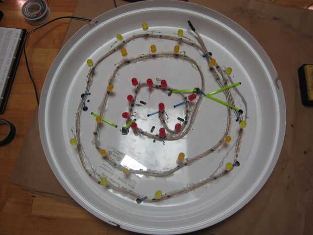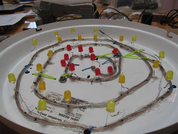 Tengo el transformador de una venta de garaje por $1.00. Corte el extremo y se quedan con dos cables para unir a su proyecto. Nota importante: el voltaje de cualquier transformador enchufable es casi nunca lo que dice, por favor haga una prueba de voltaje antes de conectar el transformador a su proyecto (confía en mí en esto!!). Los LED ' s tal vez cuestan alrededor de $4,00 de eBay (tamaño 10 mm). Cable de altavoz fue dejado sobre un proyecto anterior. Tuvo que pedir más resistencias a hacer todos los treinta LEDs--quizás $8,00 por eso que incluye envío y manejo (de Mouser Electronics) (http://www.mouser.com/). Un proyecto en general barato.