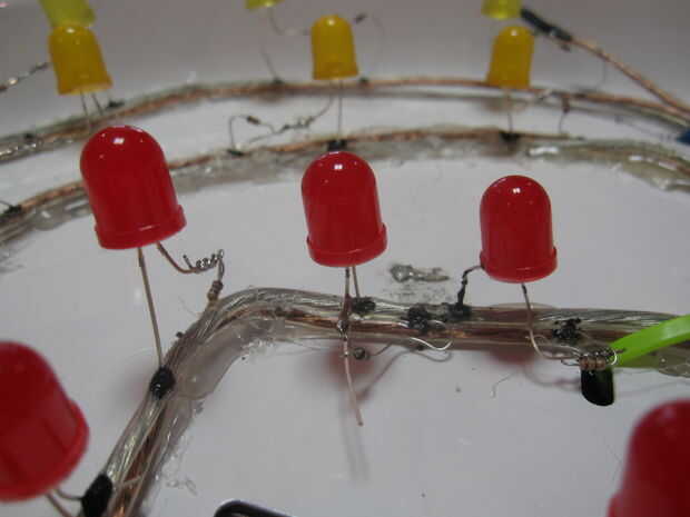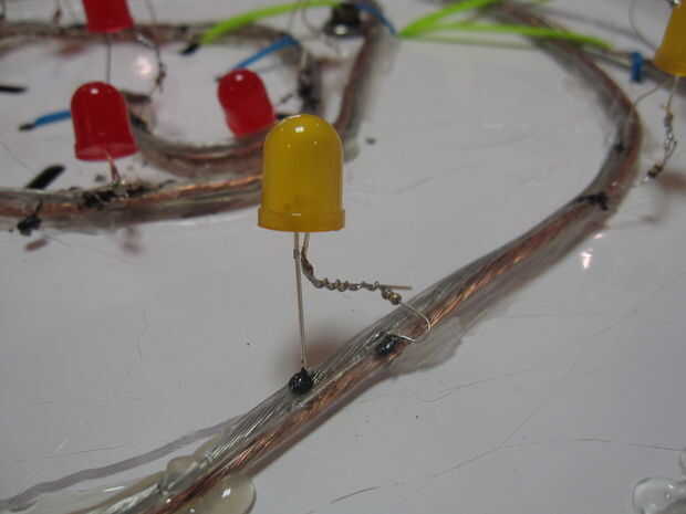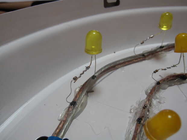 I calcula qué tipo de resistencia necesito para mi proyecto usando la calculadora en línea para múltiples LEDs situado aquí: http://led.linear1.org/led.wiz . Entonces, todo lo que tenía que hacer era Suelde la resistencia a una de las patas de un LED meter esa pierna en uno de los cables de dos altavoces y meter la otra pata del LED en el cable del altavoz. Usé alambre pegamento para pegar los LEDs en su lugar (porque el cable del altavoz fue cubierto en plástico, utilizando una pistola de soldadura no fue práctico) y utiliza pegamento estupendo de eso.