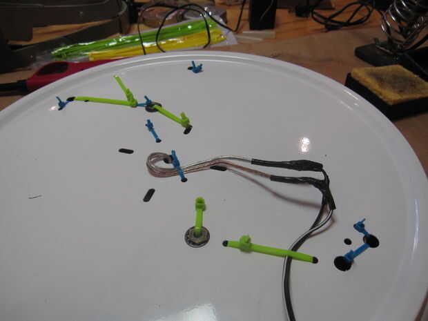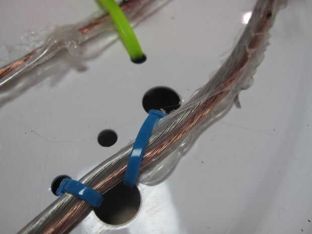 Inicialmente comencé pegando caliente-el cable del altavoz en forma de tres círculos, pero al final se vio obligado a utilizar también la ayuda de lazos zip presionado el cable. El pegamento caliente solo trabajó la mitad del tiempo manteniendo el cable del altavoz. Yo recomendaría tratar otro pegamento--ver "Después de pensamientos" a continuación.
