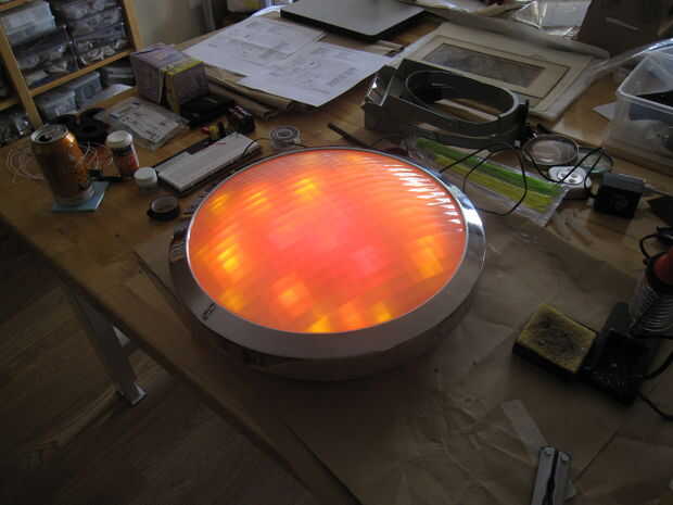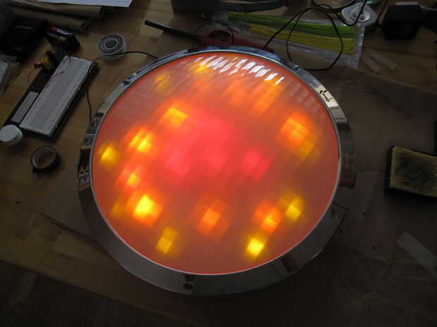 Encontré esta gran luminaria en una venta en, y sabía que tenía que hacer algo con él! Este proyecto se llama "Luz solar" porque construí con los colores del sol en mente (rojo para la base, luego naranja y finalmente amarillo en el exterior). Utilicé un transformador (AC 110V a 11.5V DC) que se enchufa en la pared para encender la luz. Los colores son fijos en su lugar y se me olvidó añadir un interruptor de palanca, pero en general me gusta mucho el producto final.