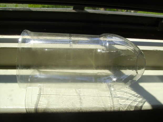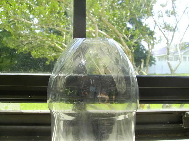 Con un cuchillo cortar la parte superior de la botella. Es mejor si se corta antes de empezar el cuello, donde el plástico no es tan grueso.