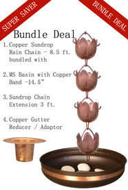 El paquete de cadena de lluvia Sundrop apelaciones al comprador más exigente, las copas de sundrop ornamentales pero funcionales despliegan para capturar la mayor parte del agua de lluvia y transporta eficientemente a lo largo de la cadena de lluvia a la cuenca. Por favor, sacar el agua lejos de los cimientos de su casa y disfrutar de la belleza de la cadena de lluvia de cobre frente a una bajada poco atractivo