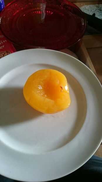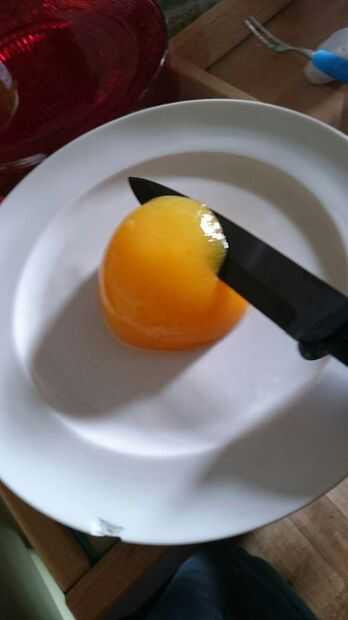 Corte una capa delgada al lado de su peach redonda, por lo que parece una yema de huevo.