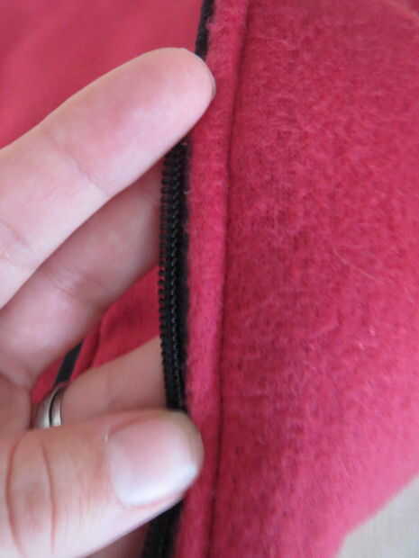 3. doble debajo de los bordes de la tela de aproximadamente 1/4" y fijar la cremallera en su lugar entre los pliegues. Trabajan una media de la cremallera a la vez. Iniciar la cremallera en el borde externo superior y terminan en el centro del borde inferior. (porque el producto final será doblado por la mitad)